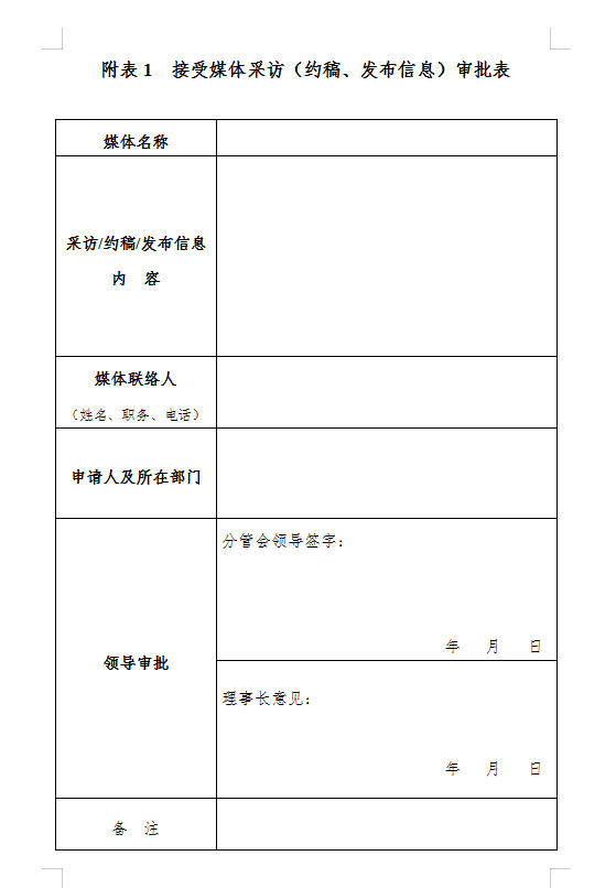 第九条 领导干部在意识形态管理工作中必须以身作则、率先垂范。本会副秘书长以上领导干部接受媒体采访、发布相关信息、以本会或分会领导名义发表文章等,必须按照相关程序进行事先审批(见附表1),待批准后方可开展上述活动。