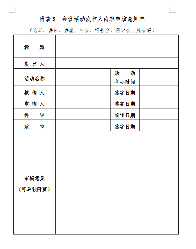 第二十四条 建立“一会一报”机制。各部门、各分会、各单位组织会议活动,由所在部门、单位、分会负责人和分管领导进行审查和备案,并填写《举办会议活动审批表》,报相关领导审批(见附表4)。影响重大的,须报本会主要负责人审批。同时,主办部门、单位、分会要对会议活动所有发言人的发言稿或PPT进行内容审核,严格执行发言内容三审制度(见附表5),坚决避免出现意识形态问题。在审核内容之时,要注意使用好智能辅助审校软件,运用先进技术手段排除各类意识形态问题隐患。