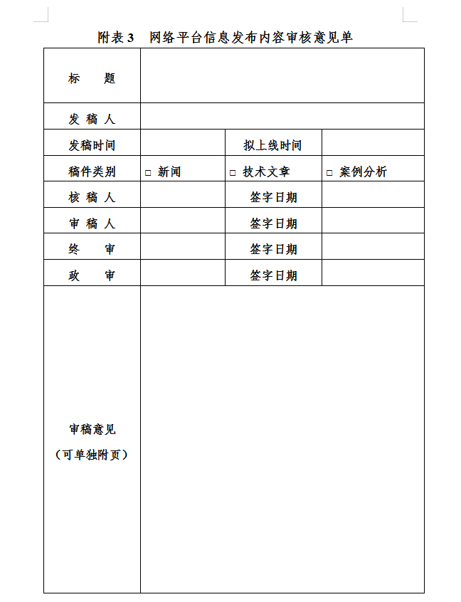 第十九条 建立信息“先审后发”机制,“谁发布谁负责,谁审核谁负责”。明确网络平台信息发布内容、信息采集渠道、信息发布权限和责任人等要求,严格执行信息发布内容三审制度(见附表3),从思想性、正确性、真实性、准确性、是否涉密等方面进行严格把关,坚持采编、审核、发布分离原则,审核流程进行痕迹管理。在审核内容之时,要注意使用好智能辅助审校软件,运用先进技术手段排除各类意识形态问题隐患。
