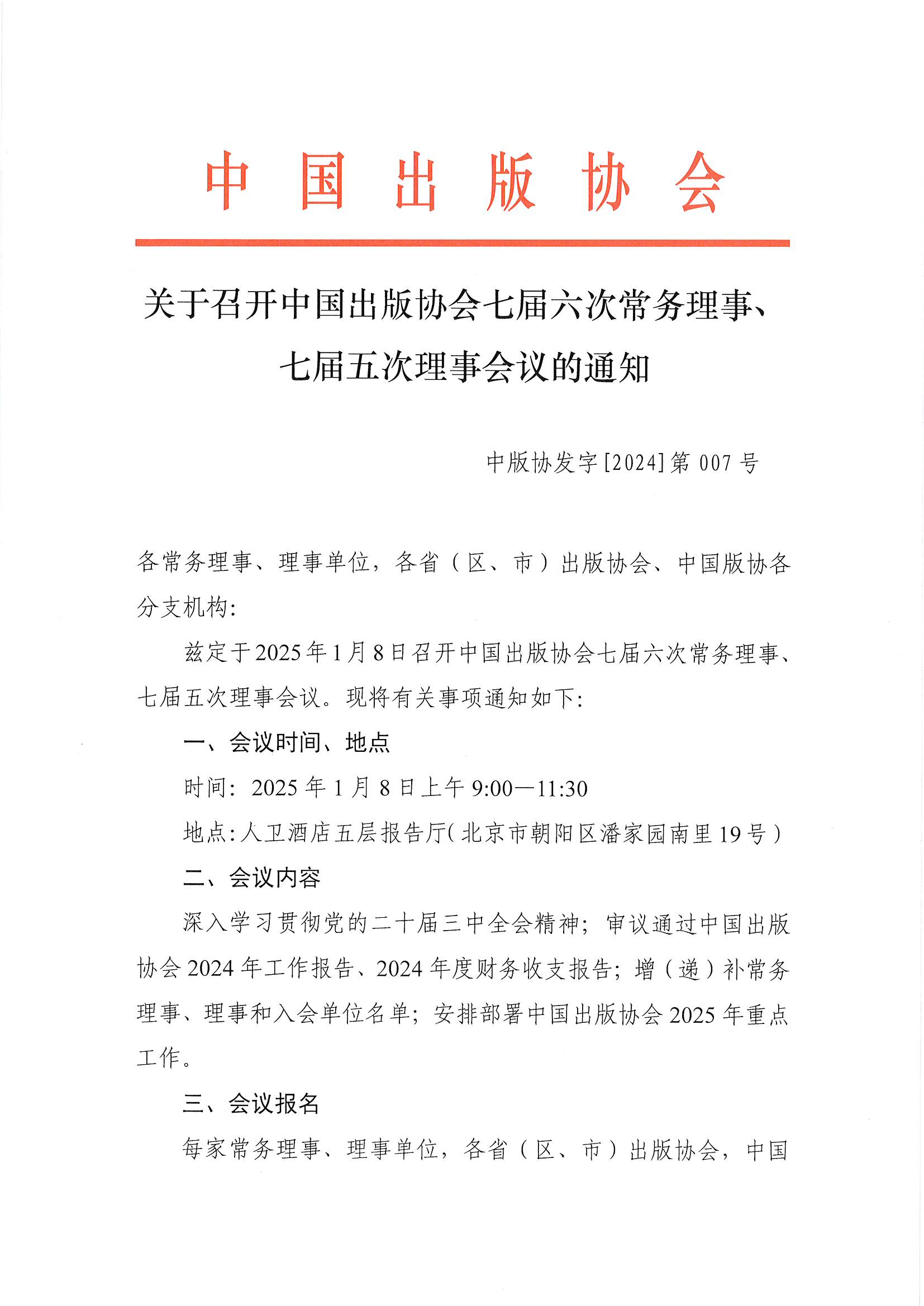 关于召开中国出版协会七届六次常务理事 七届五次理事会议的通知