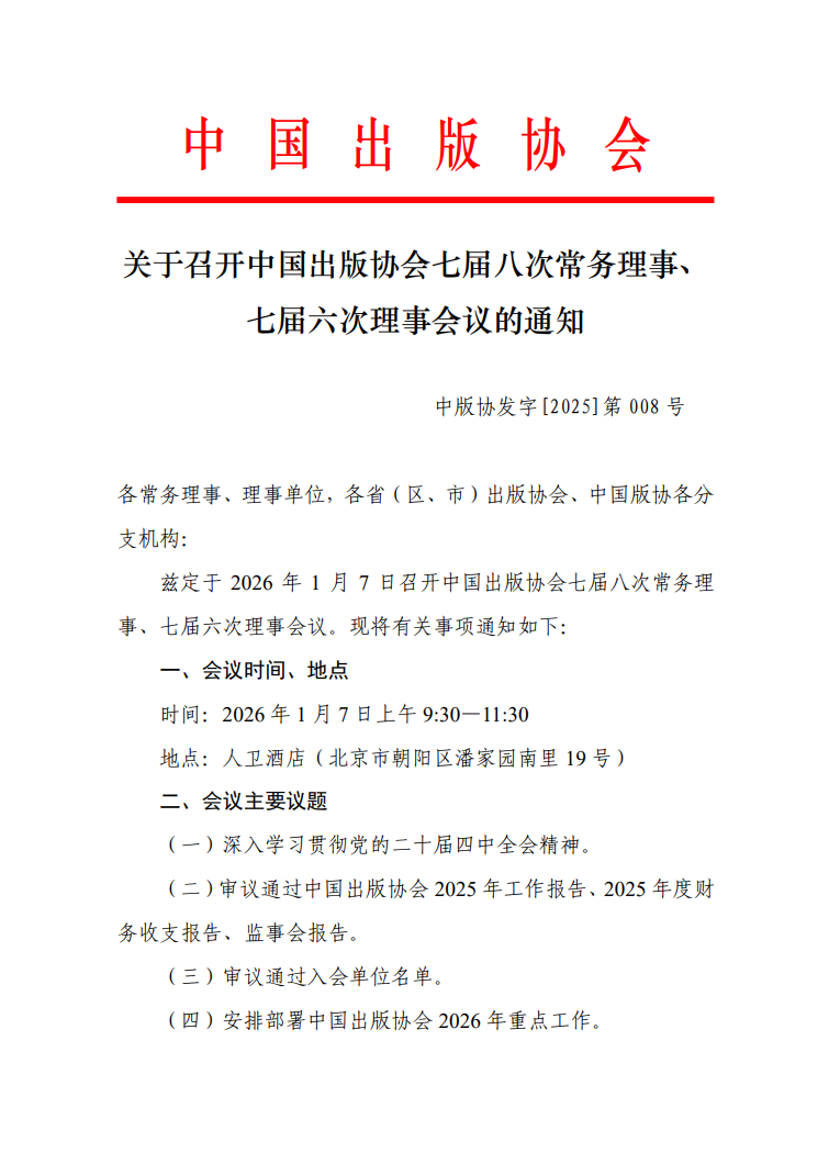 关于召开中国出版协会七届八次常务理事、七届六次理事会议的通知