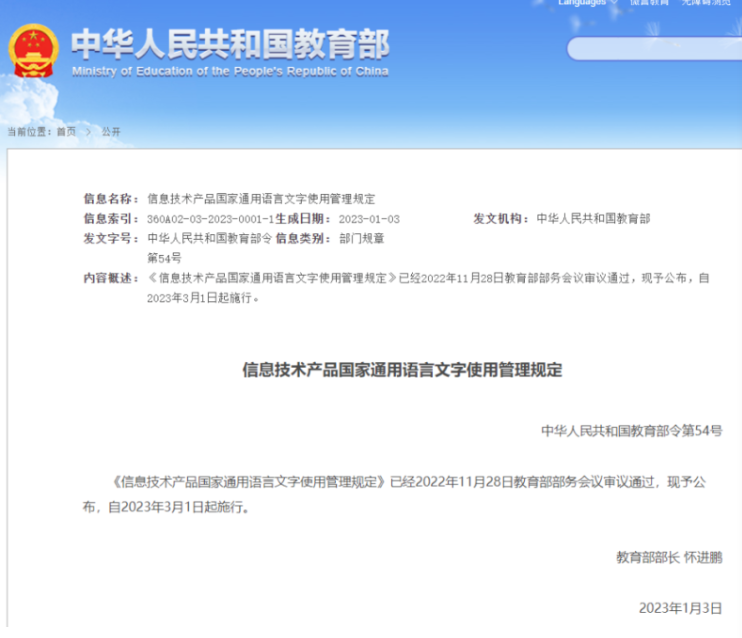 《信息技术产品国家通用语言文字使用管理规定》日前由教育部公布,自2023年3月1日起施行。该规定根据《中华人民共和国国家通用语言文字法》《中华人民共和国标准化法》《中华人民共和国产品质量法》《出版管理条例》《互联网信息服务管理办法》等法律、行政法规制定,对包括数字和网络出版物在内的信息技术产品使用国家通用语言文字作出规定。